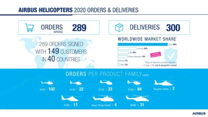 Marignane. In 2020, Airbus Helicopters logged 289 gross orders (net: 268) in a challenging market heavily impacted by the economic consequences of the COVID-19 pandemic, reinforcing the company’s position on the civil and parapublic market.