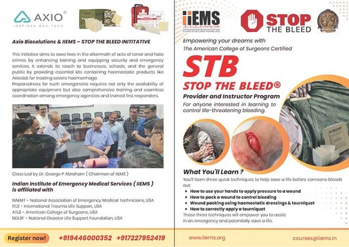 New Delhi: In a dedicated effort to enhance emergency preparedness and save lives in the wake of acts of terror and hate crimes, Axio Biosolutions has partnered with the Indian Institute of Emergency Medical Services (IIEMS) to launch the groundbreaking “STOP THE BLEED” initiative. This programme is designed to strengthen the response capabilities of security personnel, emergency services, businesses, educational institutions, and the general public by providing vital training and essential haemostatic kits.