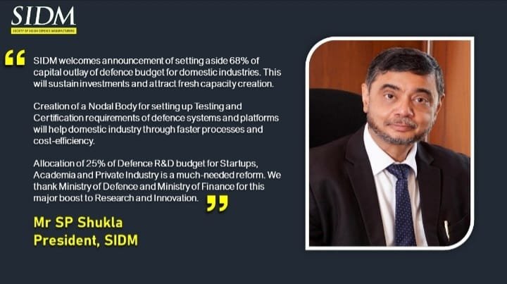 The Society for Indian Defence Manufacturers (SIDM) welcomed the announcement of setting aside 68% of capital outlay of defence budget for domestic industries saying it would sustain investments and attract fresh capacity creation.