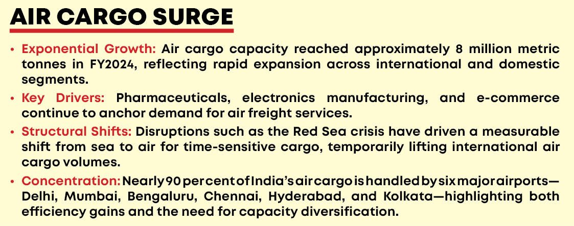 Air cargo, in particular, has emerged as a critical enabler of India’s trade ambitions. Handling capacity touched approximately 8 million metric tonnes in FY2024, reflecting the rapid expansion of both international and domestic cargo operations. While projections vary across agencies, the underlying trajectory points to sustained growth through the second half of the decade, fuelled by pharmaceuticals, electronics, high-value engineering goods, and express shipments.
