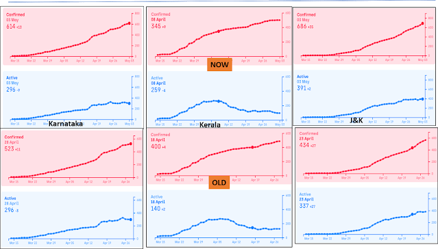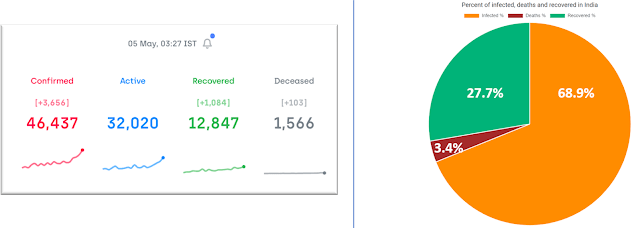 Cases in India. The status of cases in India as of today is in the graphic below. There is no doubt that the virus is spreading, and it will spread further. Let us prepare for that. However the death rate is low and most importantly the recoveries have started showing up. Most analysis is made on active cases since it gives a true picture of the status. Data is as of 04 May. The graphic below is self-explanatory.