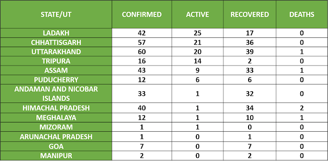 Decliners. The states where the active cases are less than 100 are tabulated below. These states need to keep it that way. They should not let their vigil down. With effort they can keep a lid on affairs and get ahead with economic revival.
