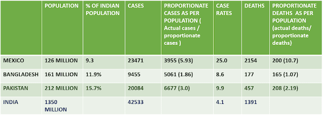 To explain further, Pakistan’s population is 15.7% of Indian population. As of 04 May it had 20084 cases and India had 42533 cases. In proportion to its population it should have had 6677 cases only. Seen from this perspective, Pakistan, in comparison to us, has three time the cases. The number of deaths is more than twice when seen in proportion. Bangladesh is slightly better off. Mexico is in a bad shape. However the details of Pakistan and Bangladesh were further compared with neighboring states in India. The results are tabulated below.