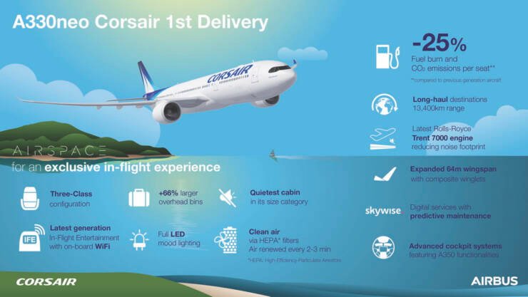 The A330neo is a new-generation aircraft and successor to the hugely popular A330ceo widebody family. As well as the new engine option, the aircraft benefits from a host of innovations, including aerodynamic improvements and new wings and winglets that together contribute to 25% fuel-burn and CO2 reductions.Corsair, which already operates an Airbus fleet of five A330 Family aircraft, became a member of the Airbus Skywise ‘Open Data Platform’ in 2020, thus benefiting from several Skywise-based services, such as a real-time in-service fleet performance analysis capability (aircraft health monitoring), reliability analysis and predictive maintenance.