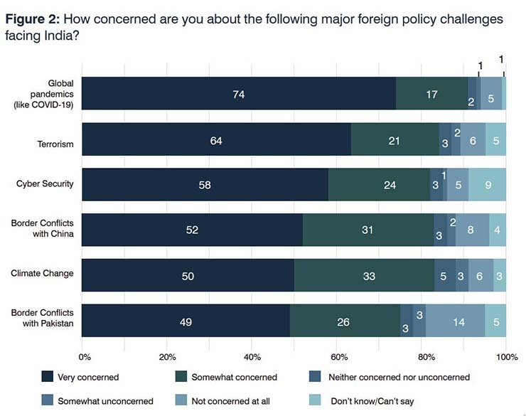 At 83 percent, there was higher concern about border conflicts with China as compared to the border conflicts with Pakistan. This is in line with the finding that 70 percent of respondents are concerned about the rise of China as a global power. Following the border conflict in eastern Ladakh in 2020, the concern regarding border conflicts with China has overtaken worry about the disputes with Pakistan. Three-quarters of respondents (75 percent) said they were very concerned or somewhat concerned about border conflicts with Pakistan.