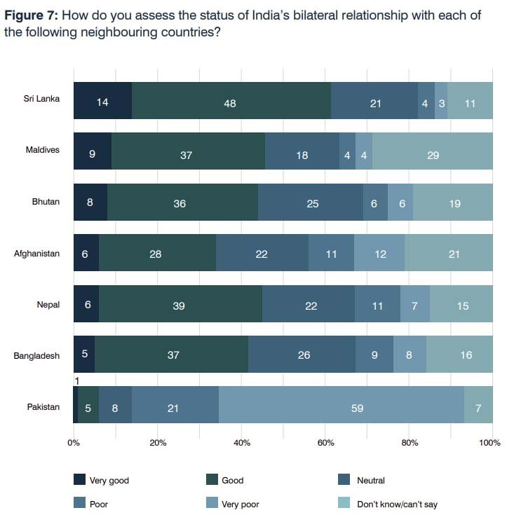 Among the various focus areas in the survey included improving ties with the US (82 percent) and improving relations with immediate neighbours other than Pakistan or China (79 percent). This is echoed in the heightened trust ratings of the survey respondents towards countries like Sri Lanka (68 percent) and Bhutan (55 percent). There is lower priority placed on resolving differences with Pakistan and China, as compared to other issues.