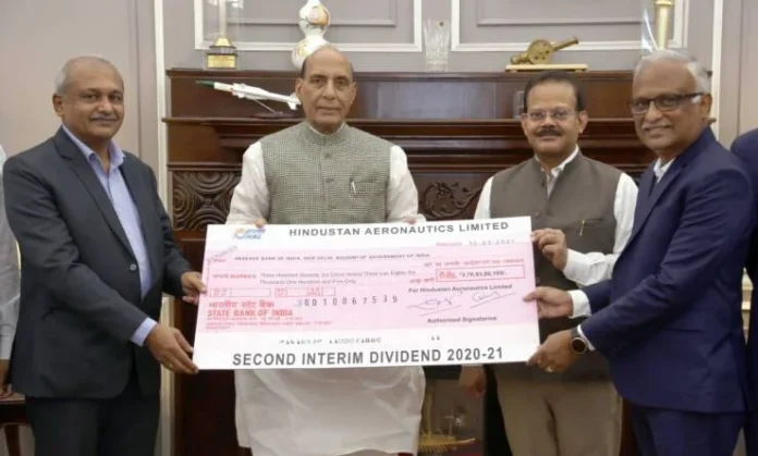 New Delhi. Defence Public Sector Undertaking (DPSU) Hindustan Aeronautics Limited (HAL) paid the second interim dividend of Rs 376.93 crore for the Financial Year (FY) 2020-21 to the Government. The dividend cheque was handed over to Defence Minister Rajnath Singh by Chairman and Managing Director (CMD) of HAL R Madhavan and Director (Finance), HAL CB Ananthakrishnan in the presence of Secretary (Defence Production) Raj Kumar in New Delhi on March 10.