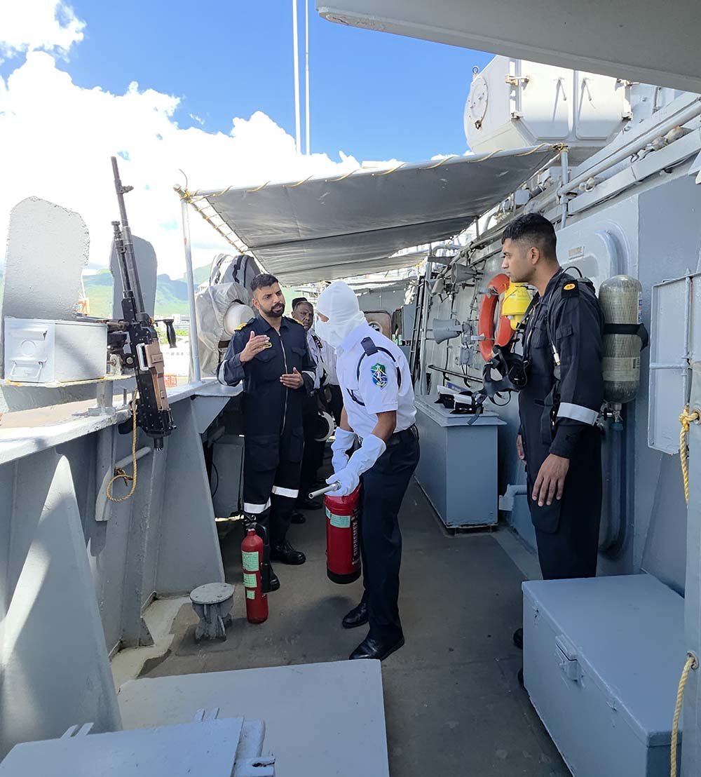 Training capsules were also conducted onboard for Mauritius National Coast Guard personnel on practical aspects of harbour and sea watchkeeping, including firefighting and damage control. The ship was open to visitors on March 12 and hosted over 500 visitors.