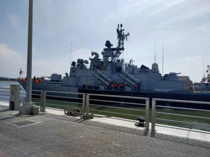 These include a 76.2 mm medium range gun, 30 mm close range guns, chaff launchers and long range surface to surface missiles. The ship, built indigenously at Goa Shipyard Limited (GSL), bears testimony to capabilities of the Indian ship building industry and is a versatile platform capable of performing a wide variety of surface warfare missions.