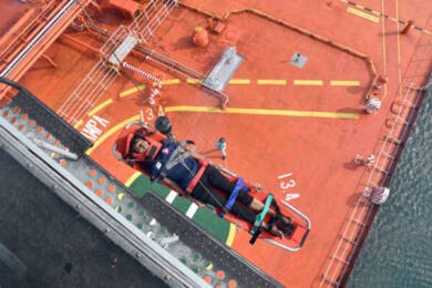 Attempts by ship’s agent M/s JM Baxi & Co to transfer the patient to a tug failed due to high swell in the area. The patient being unconscious, also added to the complexity of the transfer.