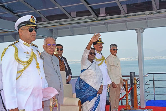 President Droupadi Murmu, the Supreme Commander of the Armed Forces, reviewed the Fleet from INS Sumedha, an indigenously built Offshore Patrol Vessel, which served as the Presidential Yacht for the occasion. INS Sumedha was adorned with the Ashoka Emblem and flew the President’s Standard at the mast.