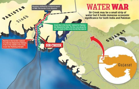 Sir Creek is a 96 km strip of water in the marshes of the Rann of Kutch in Gujarat. It is a disputed region between India and Pakistan. The creek roughly separates the Kutch region in India and Pakistan’s Sindh province. Sir Creek opens up into the Arabian Sea. It was originally named Ban Ganga and was renamed Sir Creek during colonial times after a British official. Sir Creek is a strategically important region, and Indian and Pakistani troops had clashed in the Rann of Kutch in the 1965 war. It is an important fishing ground and is one of the largest fishing sources in Asia. Another reason for its significance is the possible presence of oil and gas reserves under the sea in that area. It is currently unexplored because of the ongoing border dispute. The area is also of great ecological importance, as it is home to flamingos and other migratory birds in the winter.