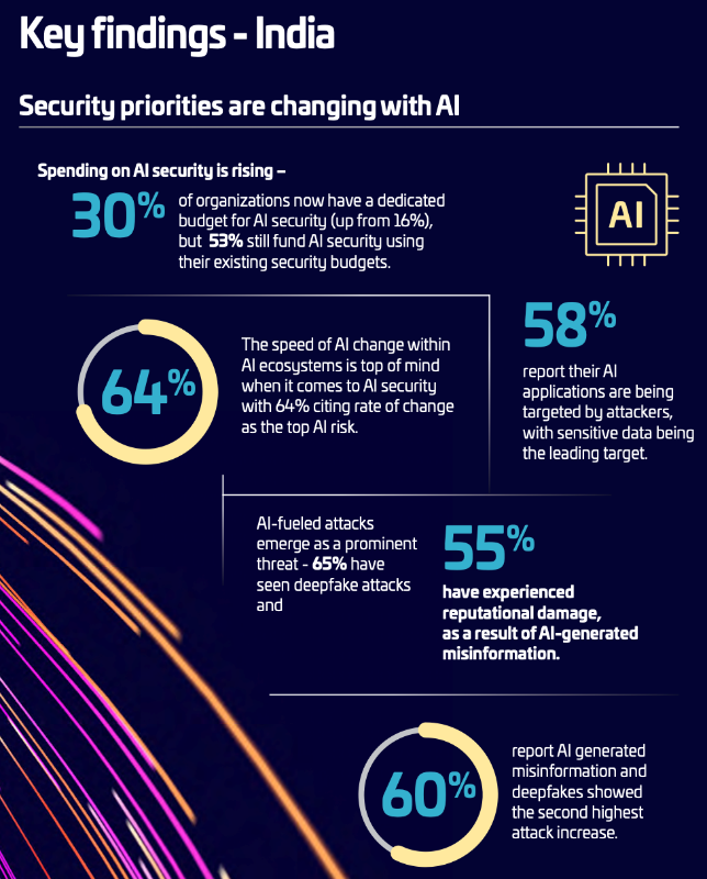 While organisations race to adopt AI, attackers are doing the same. Nearly 65% of companies in India (60% worldwide) report experiencing deepfake-driven attacks, and 55% in India (48% globally) report reputational damage tied to AI-generated misinformation or impersonation campaigns.