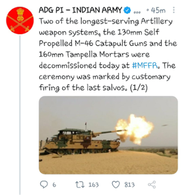 When the Artillery Profile 2027 was written in 2008, it was visualised that the 130 mm Catapult and 160mm Tempella Heavy Mortars would de decommissioned and made obsolete in a couple of years. However that was not to be for many reasons. Finally these guns are being laid to rest with the induction of modern systems like the M777 ULH, K9 Vajra and PINAKA.